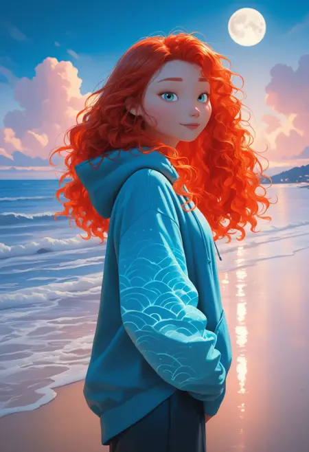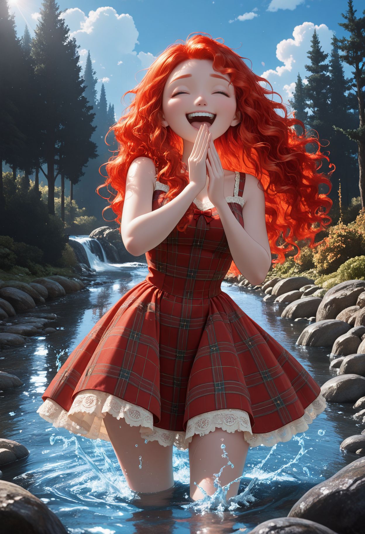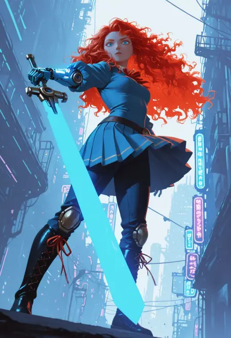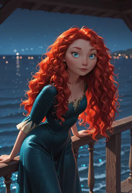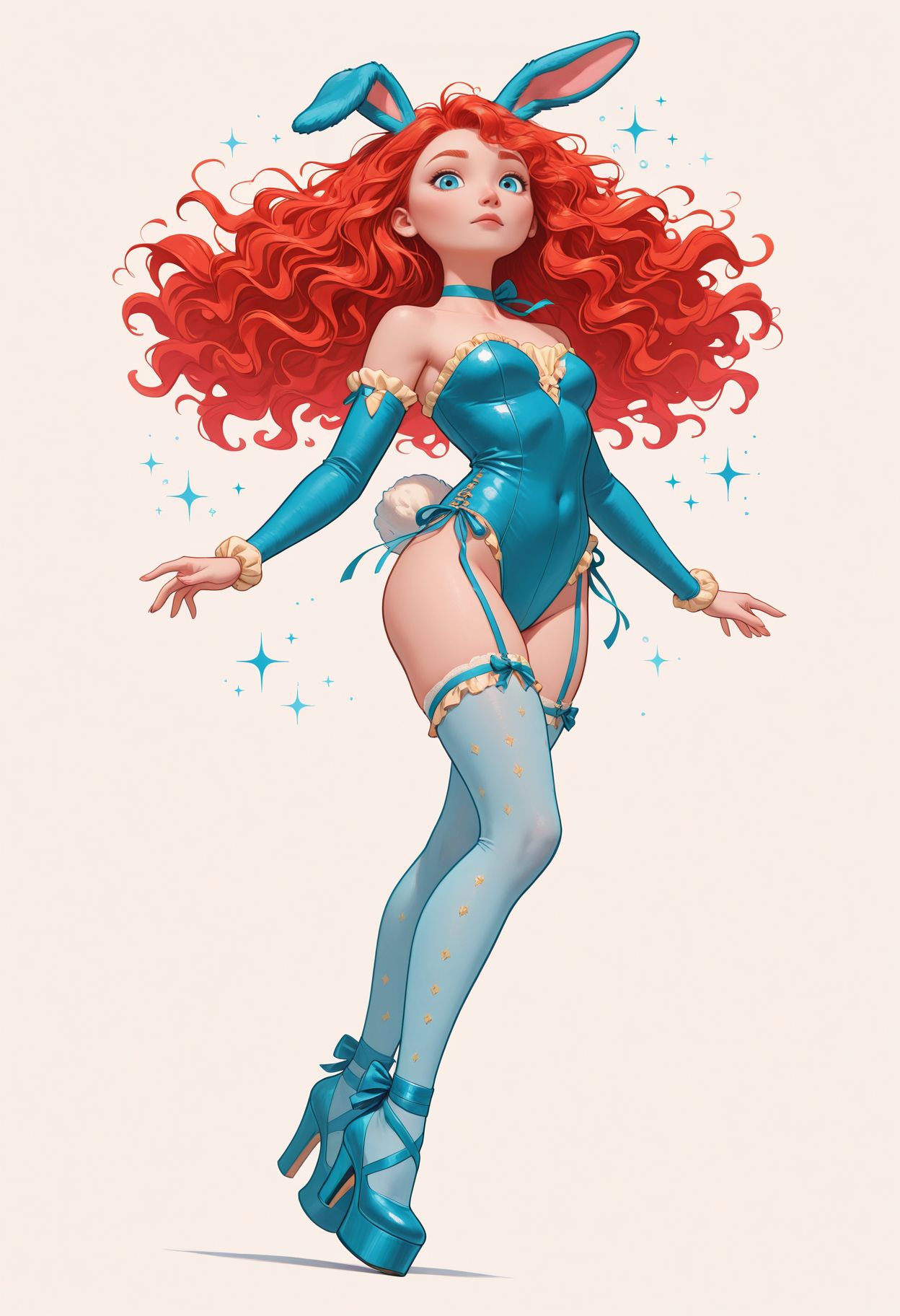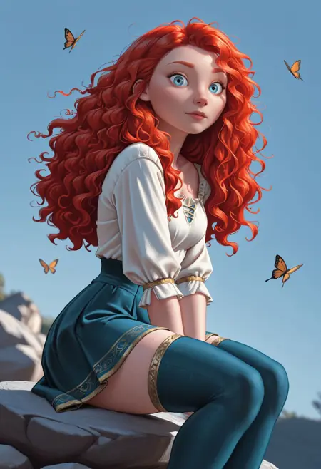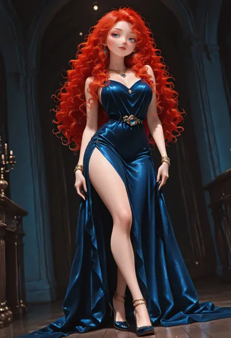 DisneyMerida, 1girl, red hair, blue eyes, long hair, wavy hair
