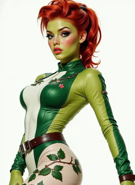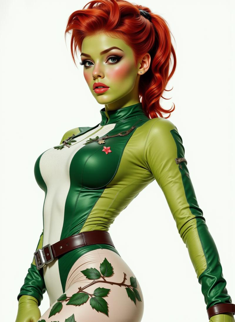 A photo of P0ison_ivy50sis, a painting of a woman with red hair, green skin, and a green and white costume. She is standing on a rock, looking up with a determined expression on her face. The painting is in a fantasy style, emphasizing the woman's costume and her interaction with the environment.