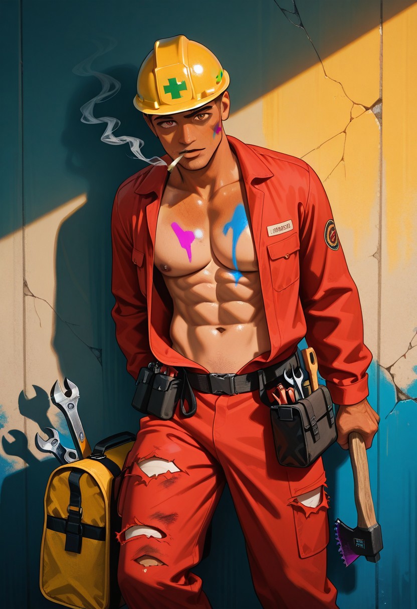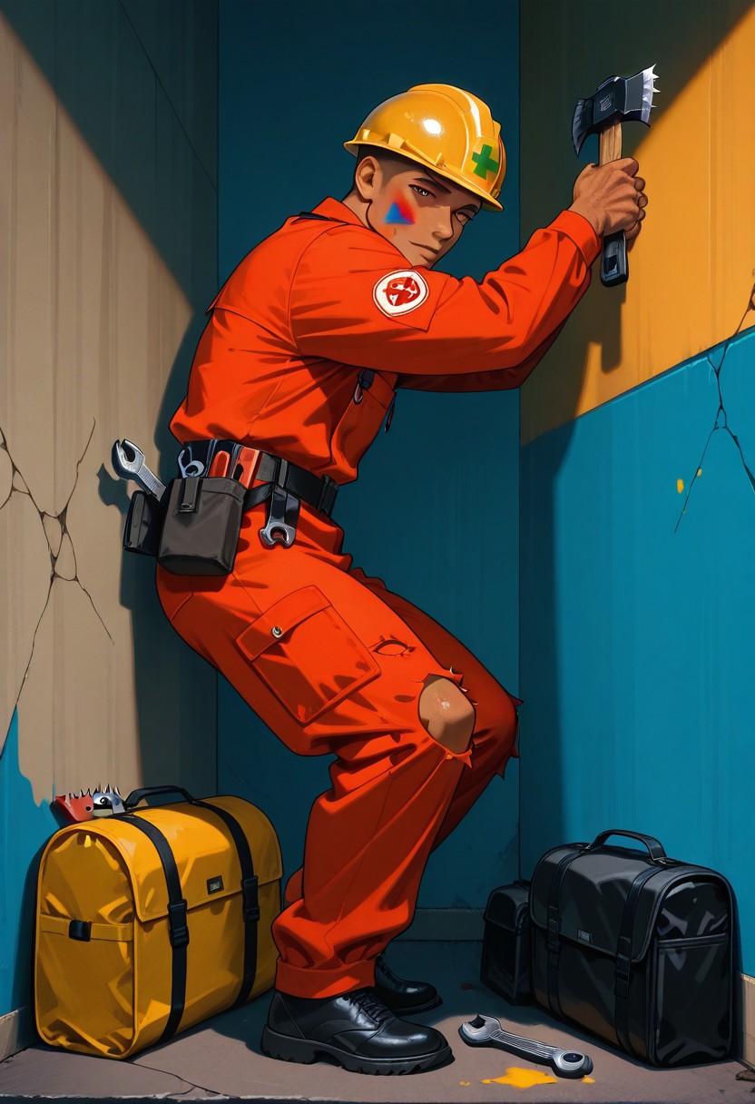 빨간 작업복 착용,