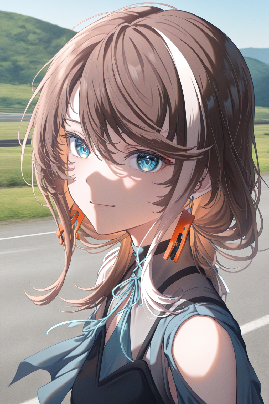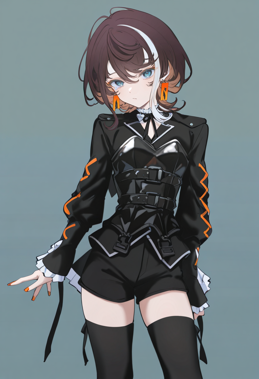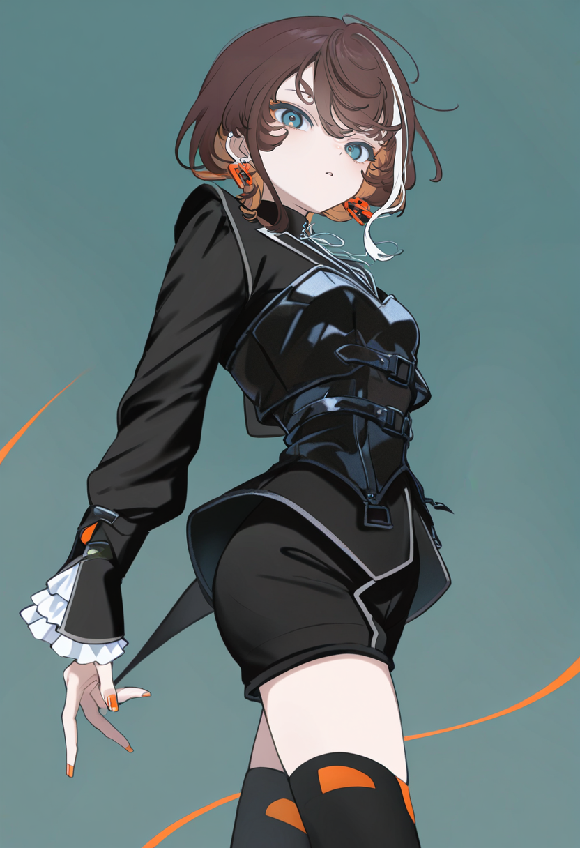 갈색 머리, 다색 머리, 파란 눈, 주황색 손톱, 귀걸이, 검정 재킷, 리본, 긴 소매, 프릴, 검정 반바지, 허벅지 양말