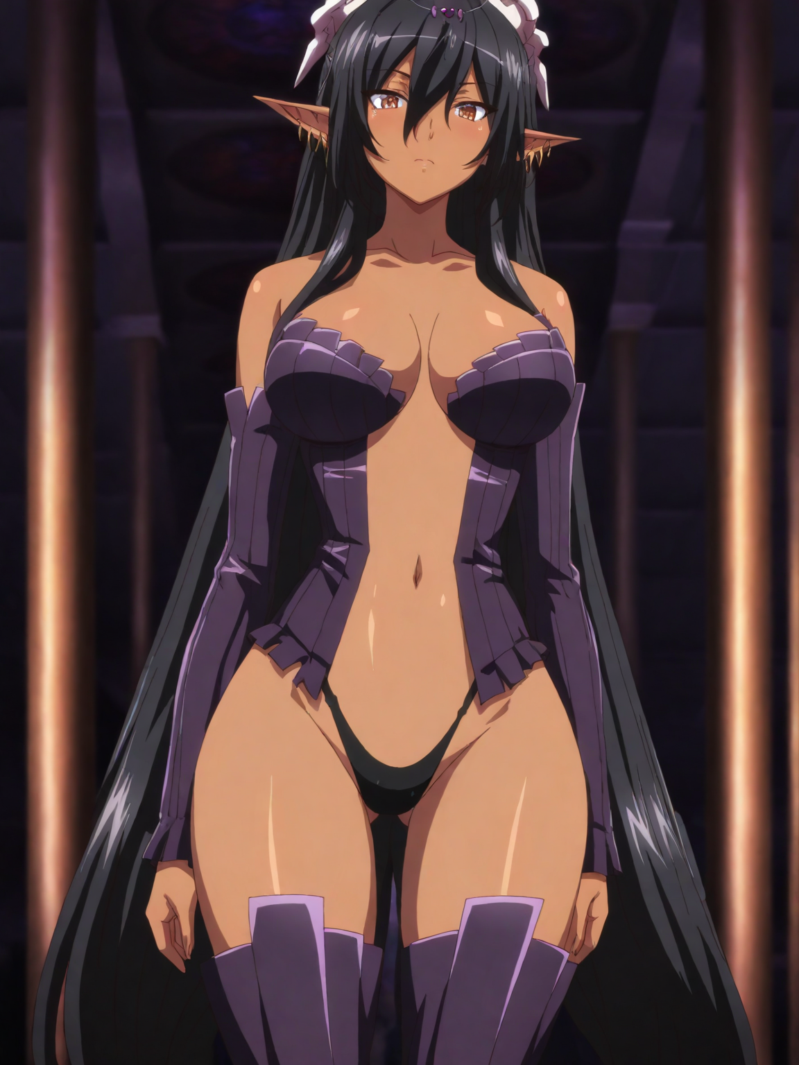 dark skin, very long hair, black hair, pointy ears, earrings, brown eyes
