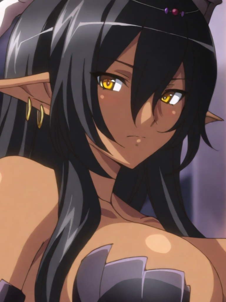 olga, dark skin, black hair, pointy ears, yellow eyes, large breasts