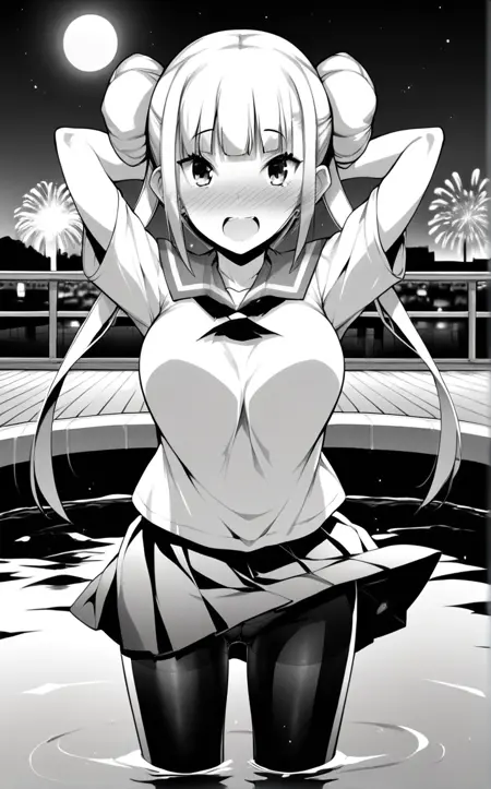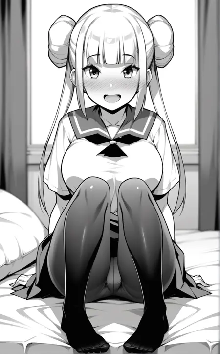Manga_KomuraiKomura_ownwaifu, 1girl, greyscale, monochrome, double bun, hair bun, long hair, school uniform, twintails, serafuku, blunt bangs, shirt, sailor collar, sidelocks, large breasts, short sleeves, neckerchief, skirt, bike shorts, bangs, pleated skirt, pantyhose, doughnut hair bun, full-face blush, eyelashes, shorts under skirt, bike shorts under skirt,