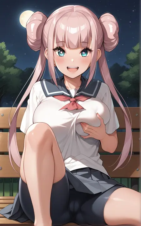 Colored_KomuraiKomura_ownwaifu, 1girl, hair bun, double bun, long hair, twintails, pink hair, blue eyes, white shirt, school uniform, serafuku, blunt bangs, short sleeves, bike shorts, sidelocks, black shorts, bangs, breasts, sailor collar, large breasts, pleated skirt, red neckerchief, skirt, eyelashes, blue sailor collar, shorts under skirt, neckerchief, bike shorts under skirt, bright pupils, black skirt, grey skirt, hair between eyes,