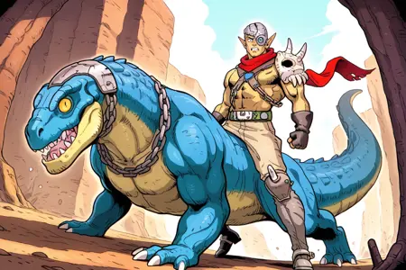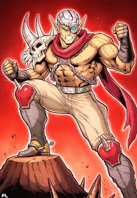 1boy, male focus, pointy ears, muscular, toned male, topless male, metal cap, mechanical eye, red scarf, chain harness, skull pauldron, belt, grey fingerless gloves, beige pants, spiked red knee pads, grey greaves, spurs