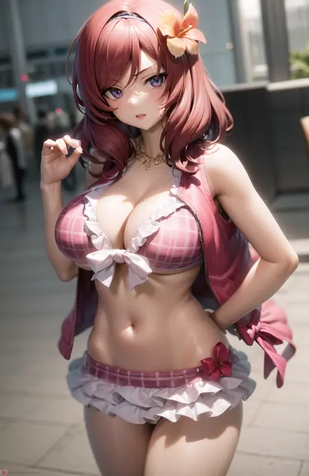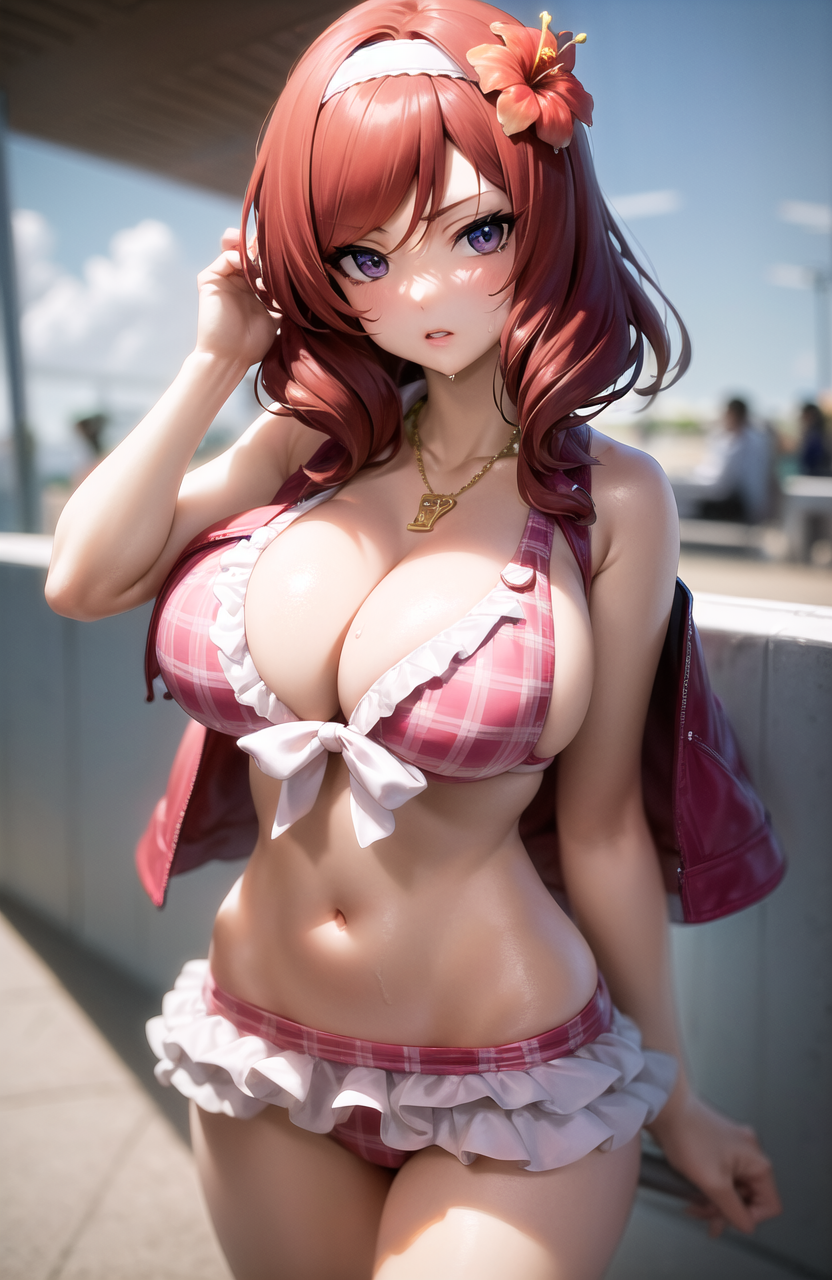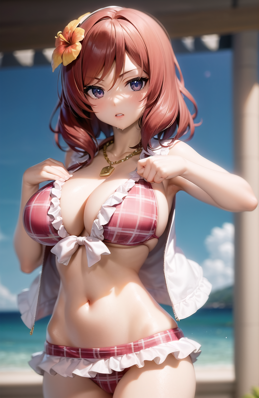 <lora:nishikino-maki-swimwear-epoch60:0.4>, nishikino maki, purple eyes, swept bangs, short hair, red hair, hairband, hair ornament, hair flower, hibiscus, swimsuit, navel, bikini skirt, frilled bikini, plaid bikini, pink bikini, front-tie bikini top, jewelry, frills, necklace, bow, vest, midriff, cleavage, open clothes, long legs,