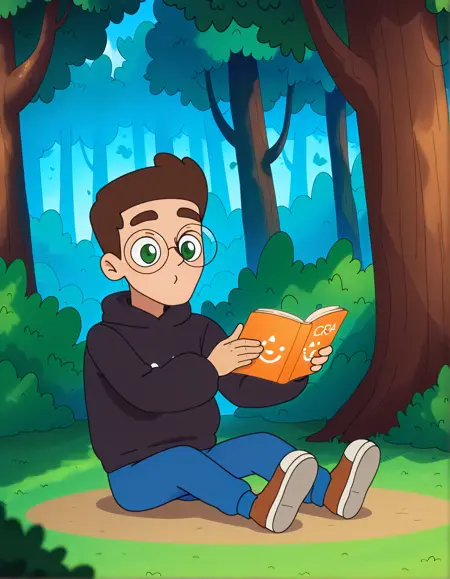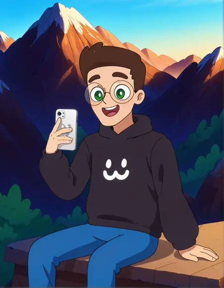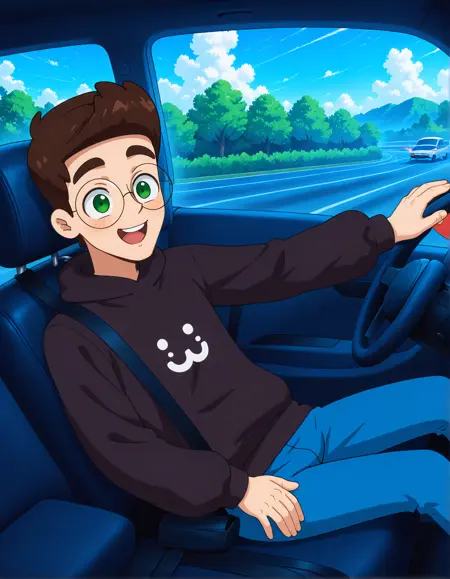 1boy, cr3at0r, adult, black hoodie, :3 on hoodie, blue pants, round eyewear, glasses, green eyes, tall,