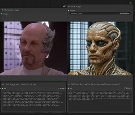 在表面(皮肤、衣物)上添加蛇类/爬行动物纹理,将眼睛虹膜变为 slit 形状,使角色整体外观更具攻击性。若未指定性别,倾向偏向女性角色。