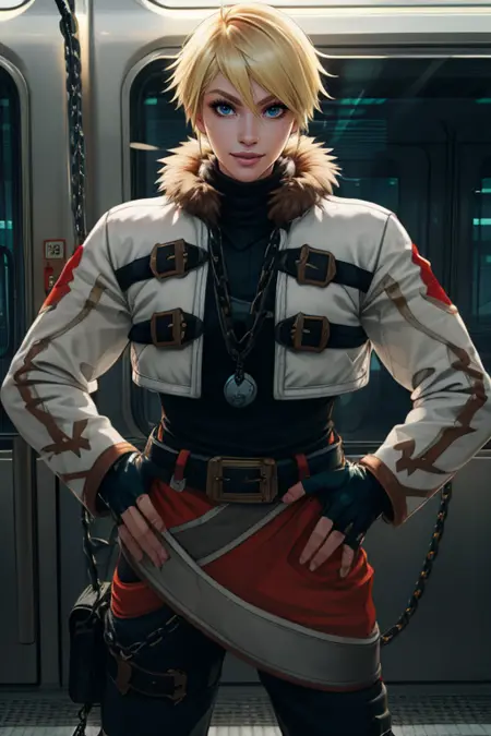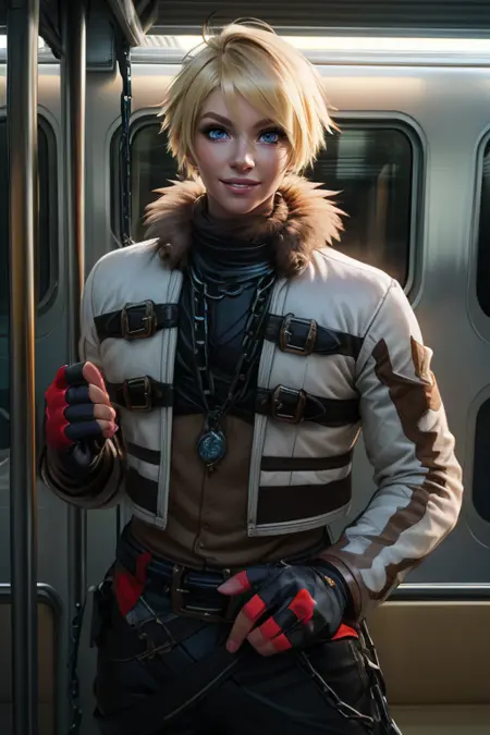 链条、手套、无指手套、腰带、毛皮镶边、裤子、白色夹克、靴子、长袖、黑色鞋履、珠宝,