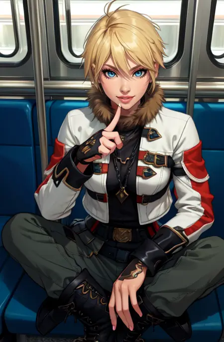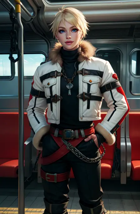 链条、手套、无指手套、腰带、毛皮镶边、裤子、白色夹克、靴子、长袖、黑色鞋履、珠宝,