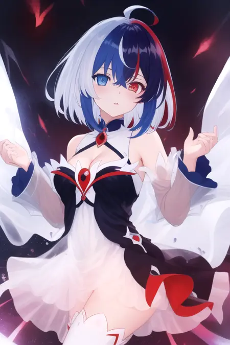 DualSeele, 1girl, solo, short hair, blue eyes, red eyes, heterochromia, thighhighs, black dress, white dress, multicolored dress, cleavage, hair between eyes, bare shoulders, blue hair, ahoge, red hair, two-tone hair, sleeveless, see-through, seele vollerei