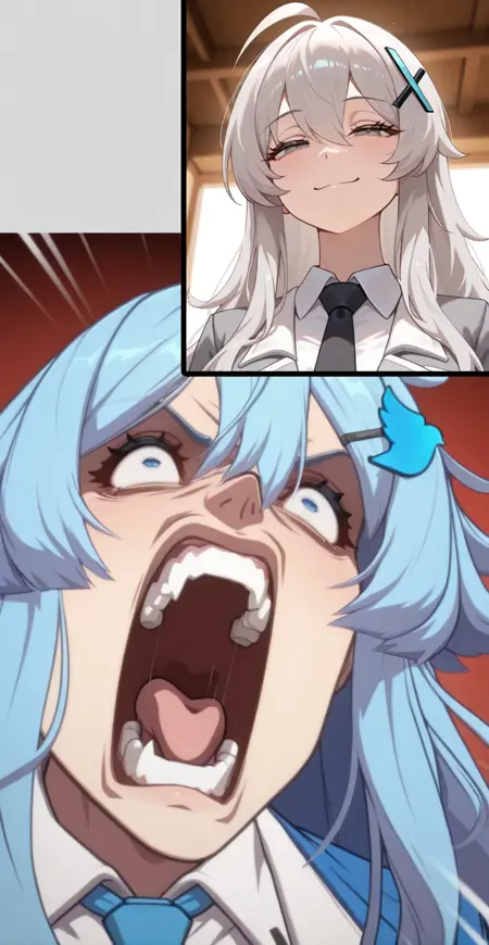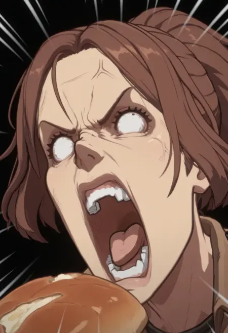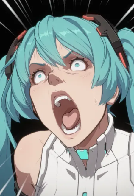 faustoverdrive, open mouth, parody, face focus, || screaming, angry, || blank eye, no pupil, || emphasis lines, black background