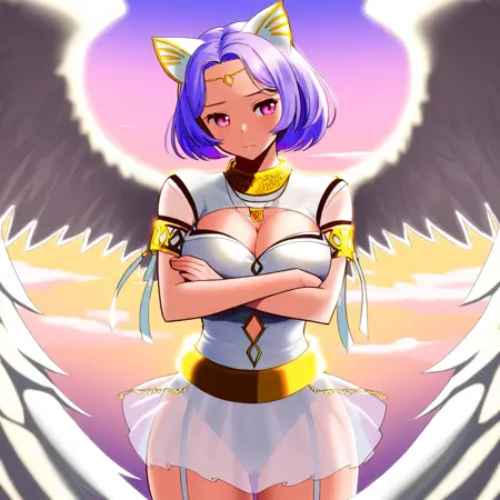 | トレーニングワード | indictus_Laura, 1girl, solo, pink eyes, large breasts, animal ears, cat ears, purple hair, short hair, wings, angel wings, jewelry, see-through,cleavage, garter straps, ribbon, skirt, leotard, necklace, white dress, cleavage, clothing cutout, barefootコピーしました! |