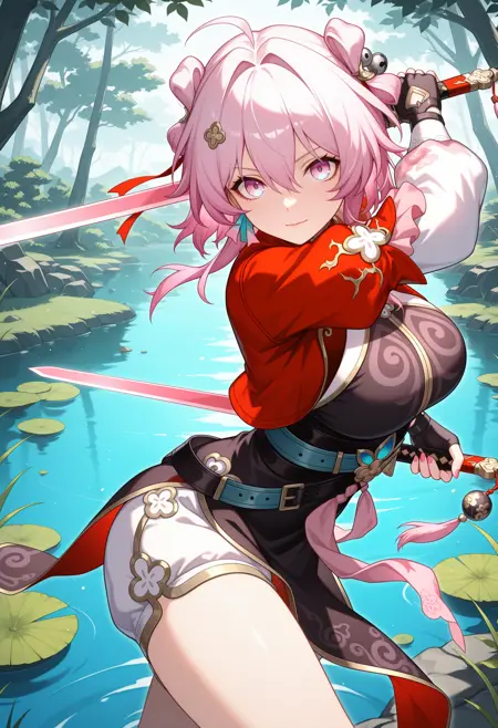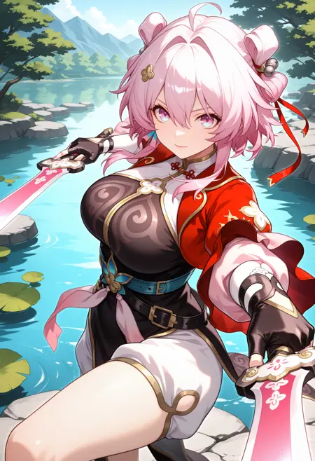 seventhmarchhunt, pink eyes, pink hair, hair intakes, hair ornament, hair between eyes,  short hair with long locks, hair bun, double bun, ahoge, gradient eyes, chinese clothes, china dress, red jacket, hair ribbon, black gloves, fingerless gloves, black dress, belt, cropped jacket, pink nails, nail polish, red ribbon, white shorts, puffy short sleeves, long sleeves, white thighhighs, black footwear, ankle boots,