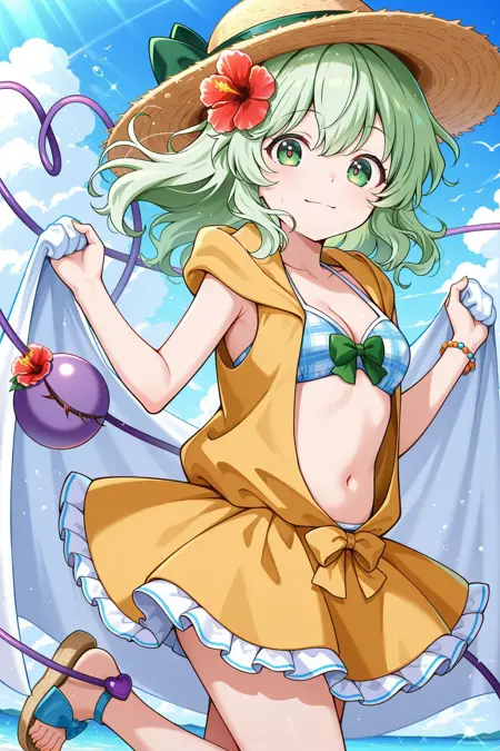 komeiji koishi, 1girl, solo, green eyes, green hair, long hair, small breasts, third eye, heart of string,, komeiji koishi \(the excited eyes of love\), alternate costume, straw hat, brown hat, hat bow, green bow, hair flower, red flower, yellow shirt, short sleeves, open shirt, plaid bikini, blue bikini, bow bikini, green bow, cleavage, midriff, bead bracelet, yellow skirt, frilled skirt, blue sandals, holding towel,