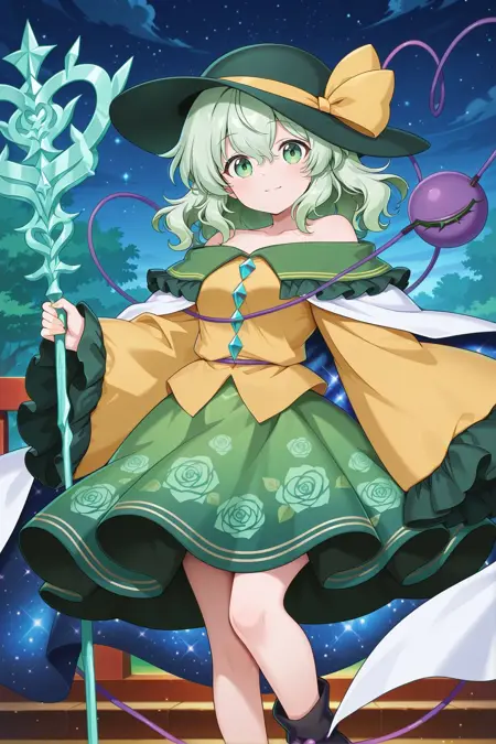 komeiji koishi, 1girl, solo, green eyes, green hair, third eye, heart of string, eyeball, breasts, aged up,, komeiji koishi \(moon reverie\), adapted costume, green hat, hat bow, yellow bow, white cape, starry sky print, yellow shirt, contrast collar, diamond button, long sleeves, wide sleeves, frilled sleeves, off-shoulder dress, green skirt, print skirt, floral print, rose print, frilled skirt, black socks, holding staff,