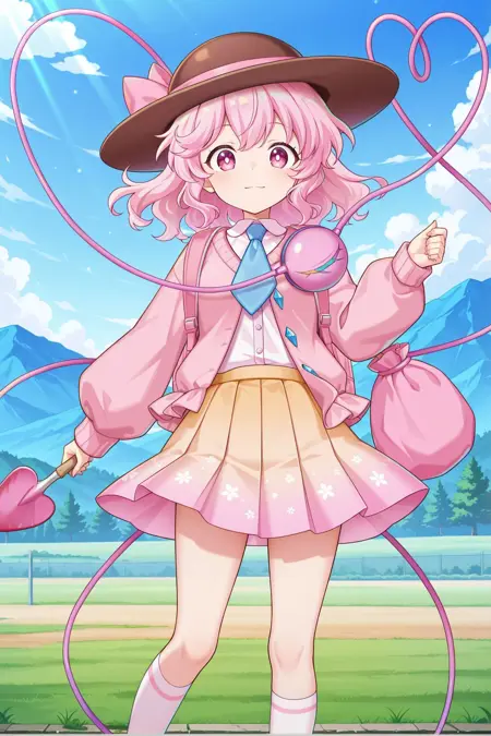 komeiji koishi, 1girl, solo, pink eyes, pink hair, long hair, third eye, heart of string, komeiji koishi \(blossomed eyes of love\), alternate color, alternate costume, alternate eye color, alternate hair color, brown hat, blue necktie, pink cardigan, collared shirt, white shirt, long sleeves, yellow skirt, pleated skirt, gradient skirt, print skirt, pink skirt, kneehighs, white socks, loafers, pink shoes, pink backpack, pink bag, holding trowel,