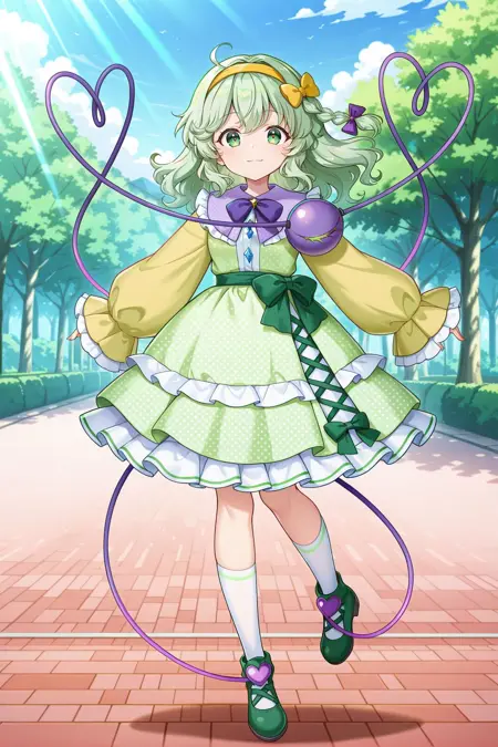 komeiji koishi, 1girl, solo, green eyes, green hair, long hair, braid, third eye, heart of string,, komeiji koishi \(midday wanderer\), alternate costume, yellow hairband, green bow, yellow bow, multiple hair bows, purple collar, purple bowtie, light green dress, polka dot dress, long dress, green shirt, frilled sleeves, long sleeves, layered skirt, frilled skirt, green skirt, cross-laced skirt, green waist bow, white kneehighs, green shoes,