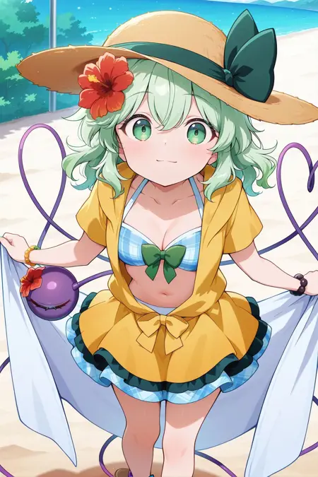 komeiji koishi, 1girl, solo, green eyes, green hair, medium hair, third eye, heart of string, komeiji koishi \(the excited eyes of love\), straw hat, brown hat, hat bow, green bow, hair flower, red flower, yellow shirt, short sleeves, open shirt, plaid bikini, blue bikini, bow bikini, green bow, cleavage, midriff, bead bracelet, yellow skirt, frilled skirt, layered skirt, blue sandals, holding towel,