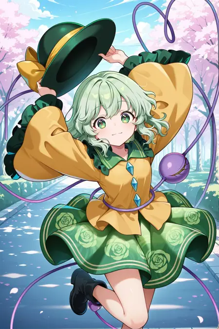 komeiji koishi, 1girl, solo, green eyes, light green hair, medium hair, messy hair, third eye, heart of string,, komeiji koishi \(subterranean\), adapted costume, green hat, hat ribbon, yellow ribbon, yellow shirt, frilled shirt collar, long sleeves, wide sleeves, frilled sleeves, diamond buttons, green skirt, rose print skirt, black socks,