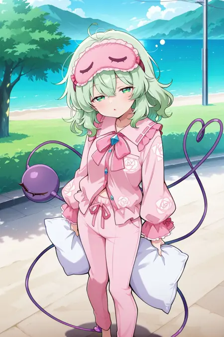 komeiji koishi, 1girl, solo, green eyes, green hair, medium hair, third eye, heart of string, komeiji koishi \(the wandering rose\), alternate costume, messy hair, sleep mask, pink bow, pink pajamas, pink shirt, frilled shirt collar, long sleeves, frilled sleeves, rose print, navel, pink pants, barefoot, holding pillow,