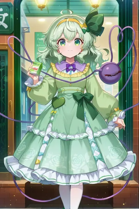 komeiji koishi, 1girl, solo, green eyes, green hair, long hair, third eye, heart of string,, komeiji koishi \(midday wanderer\), alternate costume, yellow hairband, green bow, yellow bow, multiple hair bows, purple bowtie, green dress, long dress, green shirt, frilled sleeves, long sleeves, frilled skirt, green skirt, kneehighs, green shoes,