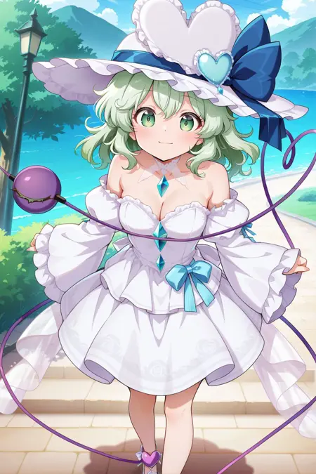 komeiji koishi, 1girl, solo, green eyes, green hair, medium hair, third eye, heart of string, komeiji koishi \(white darkness of the earth's core\), alternate costume, white hat, frilled hat, hat ribbon, blue ribbon, heart hat ornament, cleavage, wedding dress, white dress, off-shoulder dress, frilled dress, diamond button, chain, wide sleeves, white footwear, white shoes,