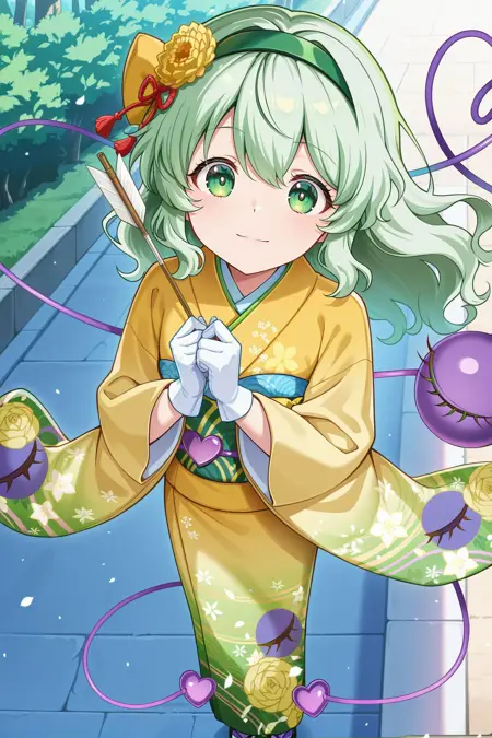 komeiji koishi, 1girl, solo, green eyes, green hair, long hair, wavy hair, third eye, eyeball,, komeiji koishi \(satori youkai praying for friends and family\), alternate costume, green hairband, kanzashi, hair bow, yellow bow, gradient kimono, yellow kimono, green kimono, floral print kimono, eyeball print kimono, long sleeves, wide sleeves, white gloves, tabi, holding arrow,