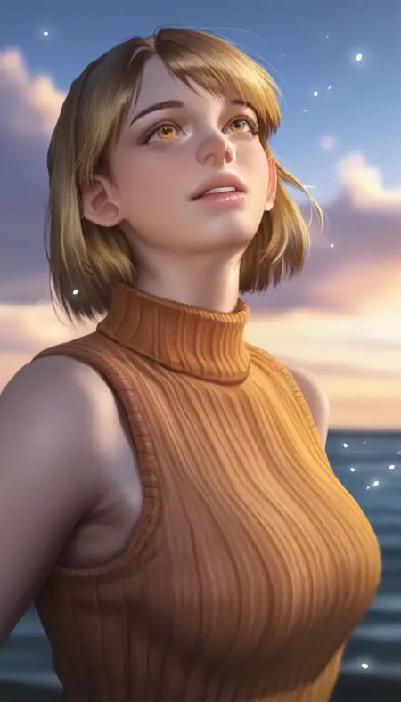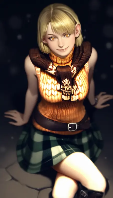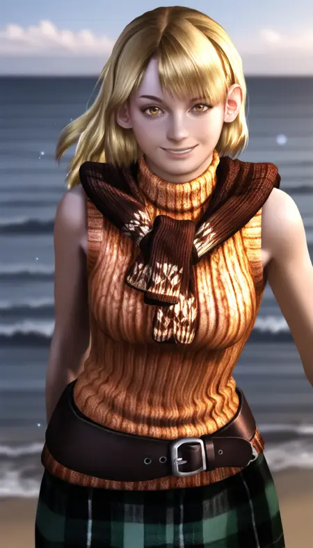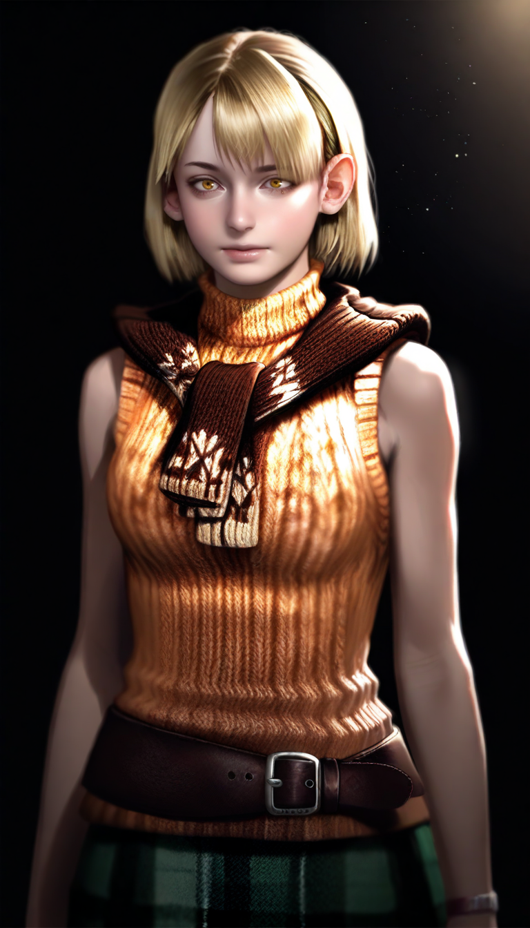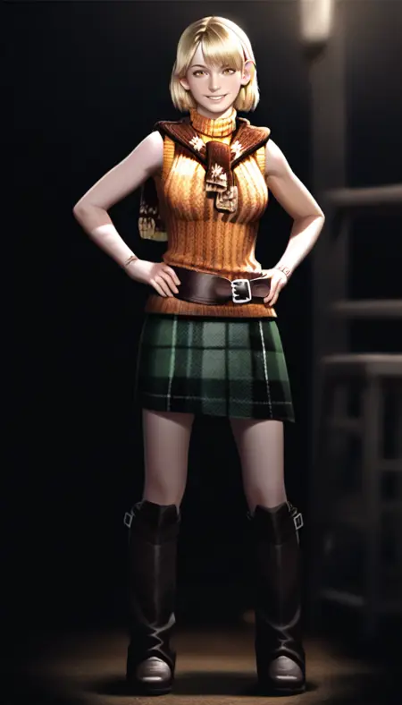 ashleygraham,realistic, 1girl,solo,blonde hair,bob cut,bangs,golden eyes, orange turtleneck,brown sweater draped over shoulder,green plaid skirt,brown belt, black knee boots,