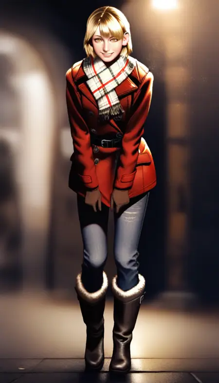 ashleygraham,photorealistic, 1girl,solo,blonde hair,bob cut,bangs,golden eyes, brown coat,plaid scarf,black belt,brown gloves,jeans,brown boots with fur trim