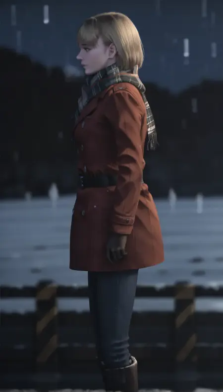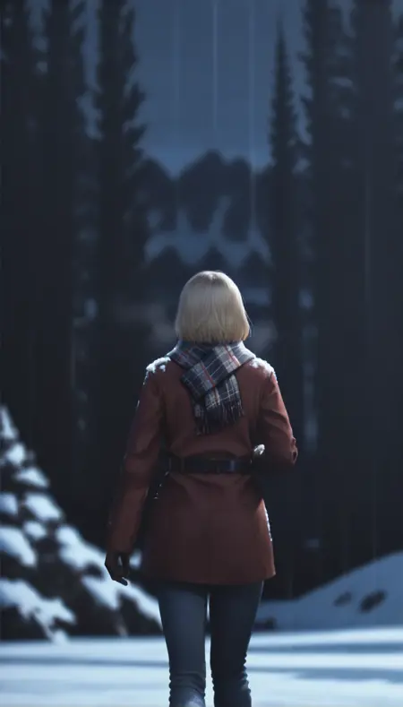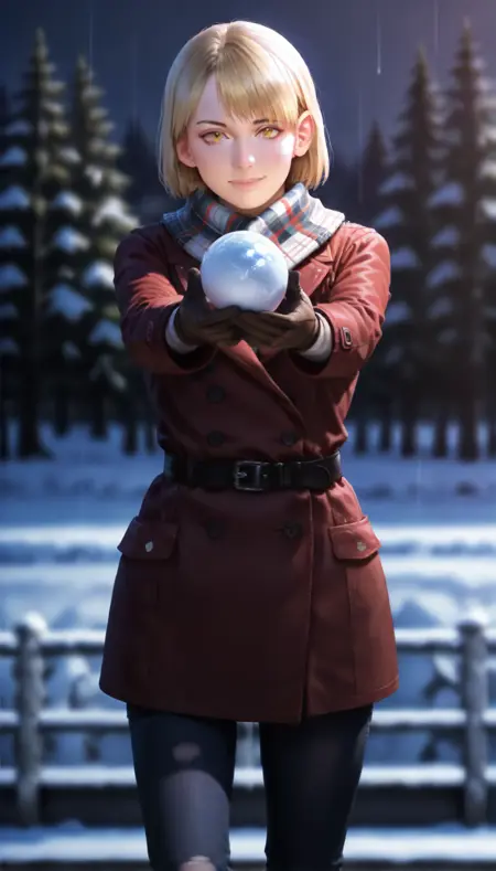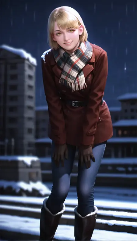 ashleygraham,photorealistic, 1girl,solo,blonde hair,bob cut,bangs,golden eyes, brown coat,plaid scarf,black belt,brown gloves,jeans,brown boots with fur trim
