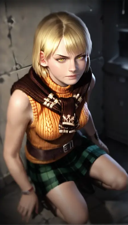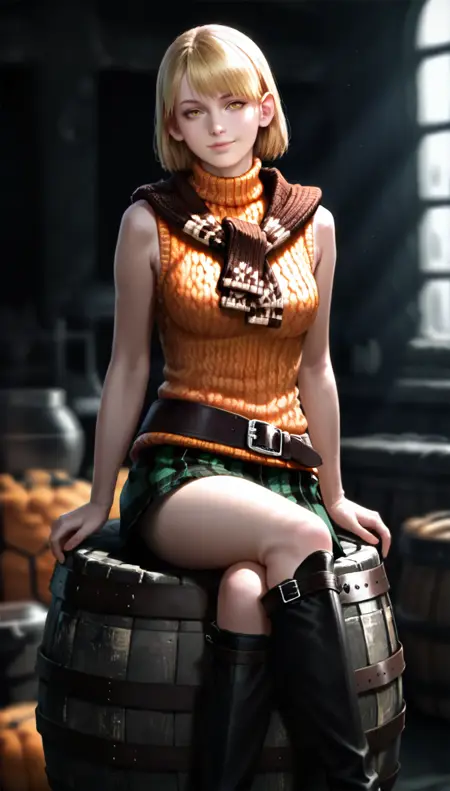 ashleygraham,realistic, 1girl,solo,blonde hair,bob cut,bangs,golden eyes, orange turtleneck,brown sweater draped over shoulder,green plaid skirt,brown belt, black knee boots,