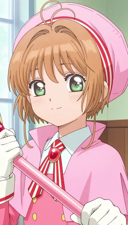 This is Kinomoto Sakura, the female character in the Japanese anime "Cardcaptor Sakura - Clear Card-hen".