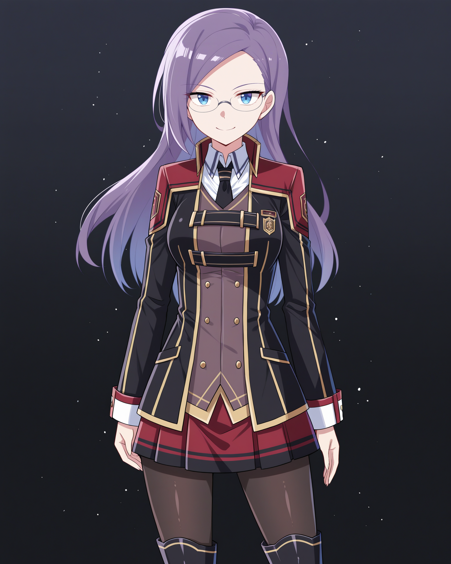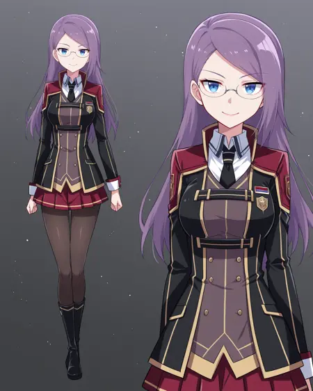 <lora:AdaGrant_Illustrious:1>, Ada Grant, 紫色の髪, 長い髪, 青い目, 中程度の胸, めがね, 学校制服, 黒いネクタイ, ミニスカート, 黒いパンティーハイズ, 黒いブーツ,