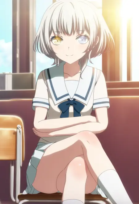 <lora:Rana KanameV1.1>,异色瞳,可奈萌拉娜,校服2,黄眼睛,蓝眼睛,灰发,短发,校服,裙子,水手服,百褶裙,校服,短袖,水手领,衬衫,白衬衫,白色水手领,袜子,白袜子,鞋子,棕色鞋履,船鞋,校服2船袜,校服2芭比袜,芭比袜,
