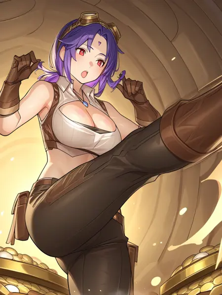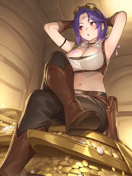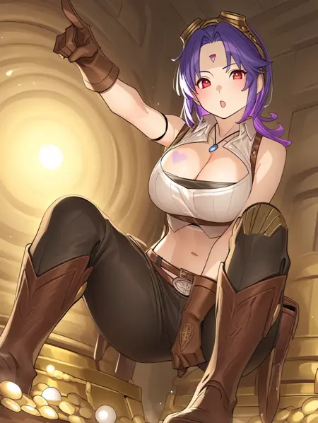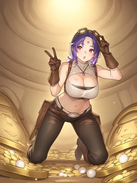 プロンプト例: hannta,purple hair,goggles on head,red eyes,pendant,sleeveless,cleavage cutout,navel,pants,brown gloves,treasure hunter,facial mark,triangle forehead jewel,