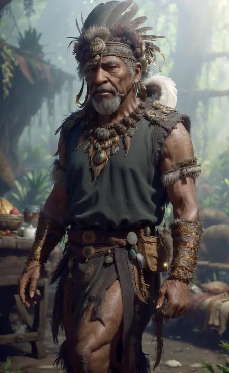 这是一个允许你生成玛雅/阿兹特克风格奇幻人物的AI模型,专为描绘我的角色扮演游戏世界“兰德赫尔文”中的西方加尔克人而设计。