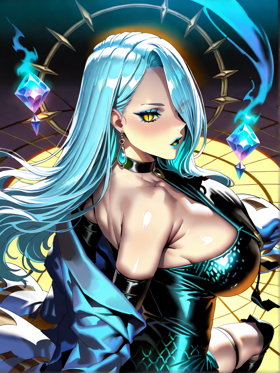 Omiisan,1girl, solo, hair over one eye, long hair, jewelry, earrings, yellow eyes, slit pupils, white hair, makeup, thigh strap, choker, large breasts,