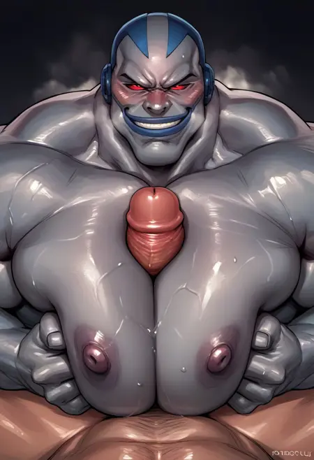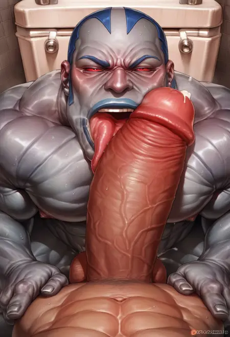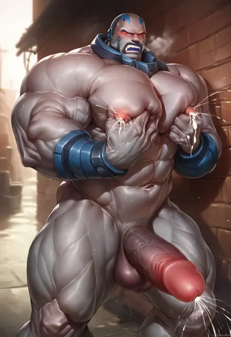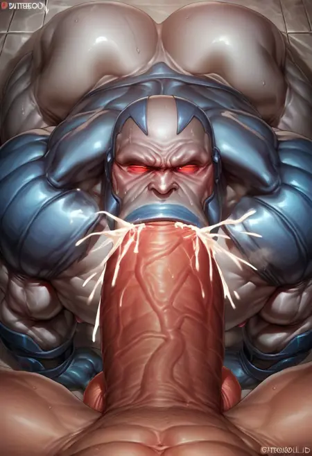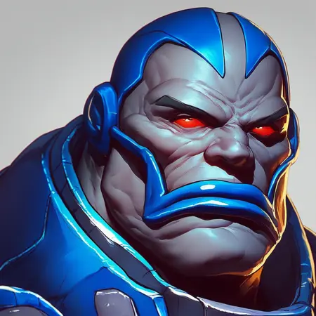 1boy, x_apocalypse, grey skin, blue lips, red sclera, bald, villain costume, muscular,