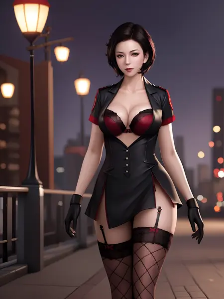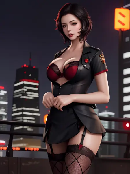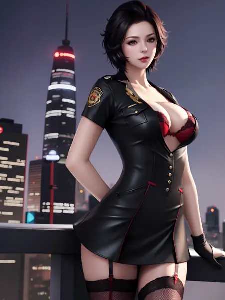 - 1girl,mature female,cityscape,night,looking at viewer,short hair,thighhighs,garter straps,bra,lingerie,gloves,fishnets,cleavage,uniform,red bra,police,short sleeves,shirt,skirt,black hair,