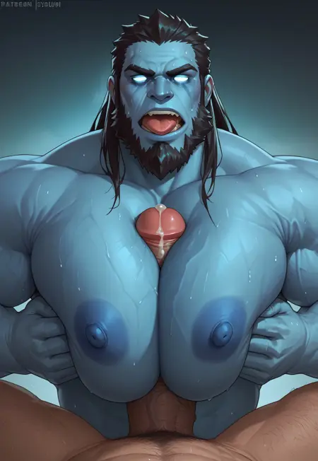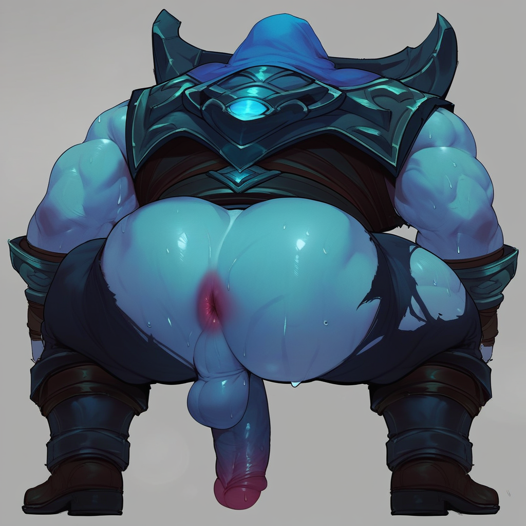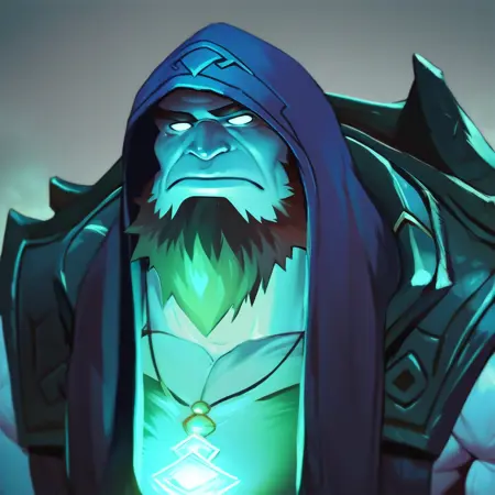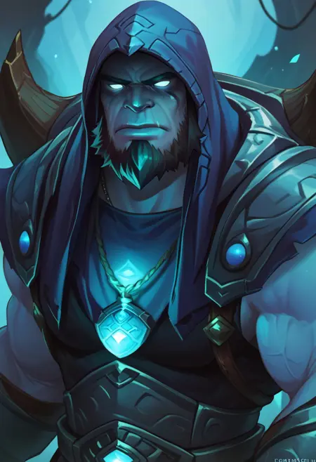 1boy, lol_yorick, muscular, blue skin, glow blue sclera, beard, hood, necklace, chest armor, belt, pants, boots, fingerless gloves,