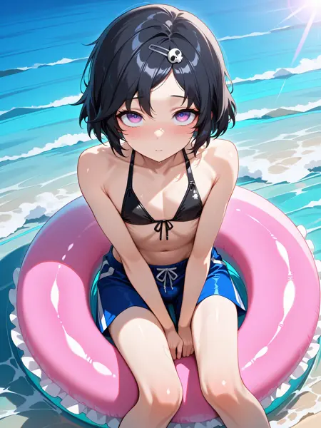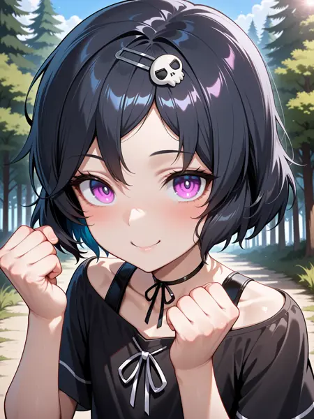 rukaillustrious, short hair, black hair, hair ornament, purple eyes, hairclip, otoko no ko, skull hair ornament, trap