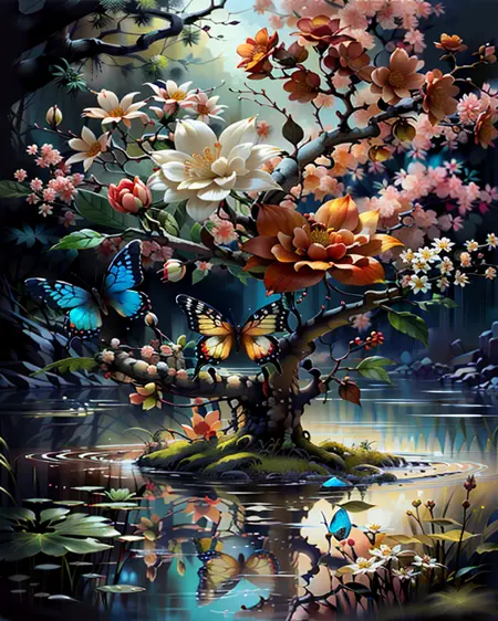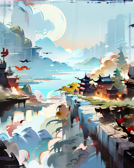 생성된 이미지에는 중국 수묵 요소가 포함되며, 수묵 스타일은 주로 배경과 붓질에 나타납니다,