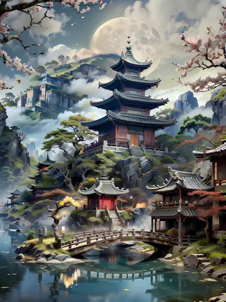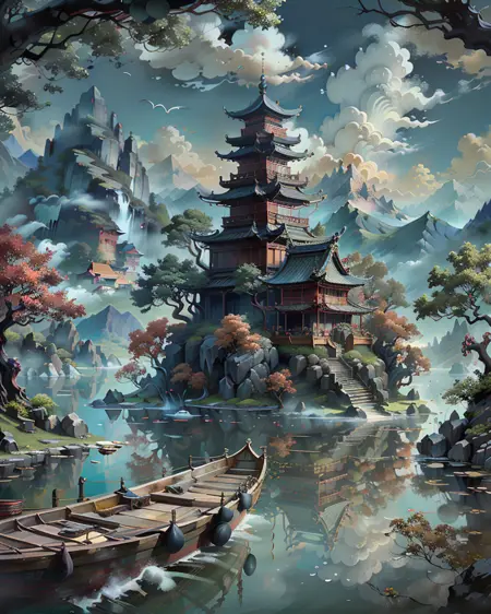 tree, brunette, water, long hair, landscape, reflection, architecture, outdoors, east asian architecture, petals, pond, lantern, grass, water, rays, flowers, sunshine, bridge, house, village, river, buildings, butterfly, Dragon, Hanfu, fog, boat 등 중국 수묵화와 관련된 키워드들;
