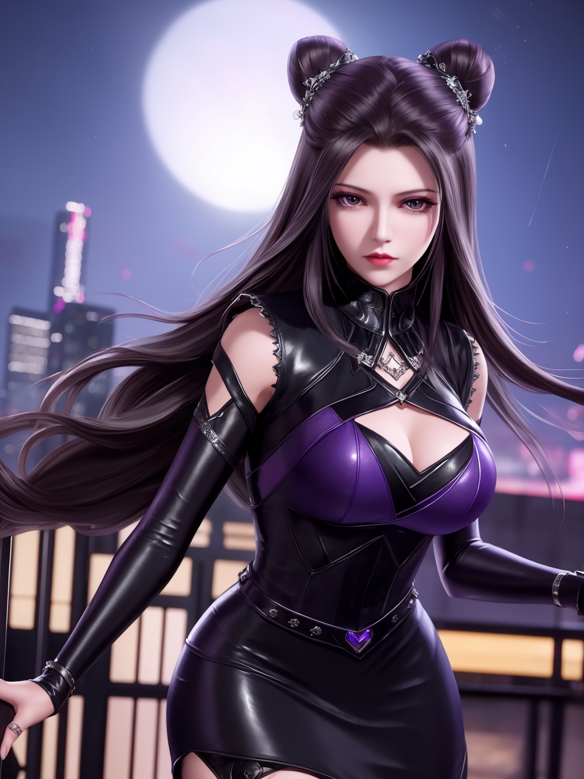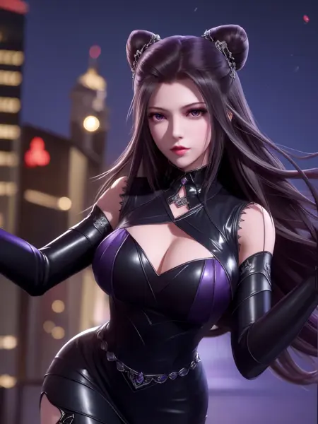 • DLDLzhuzhuqing, 1girl, solo, black hair, long hair, purple eyes, thigh boots, black dress, looking at viewer, detached sleeves, jewelry, cone hair bun, mature female, cityscape, night, cowboy shot, hand on hip,