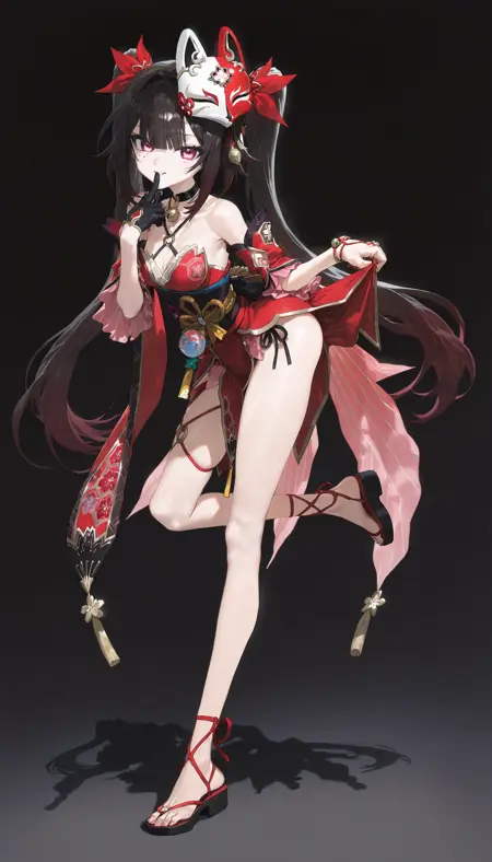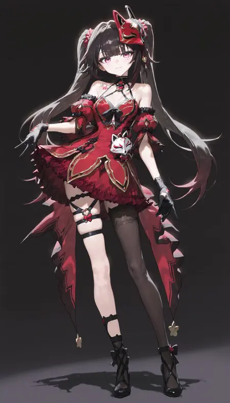 ピンクの目、黒髪、ツインテール、赤い狐のマスク、目元のほくろ、