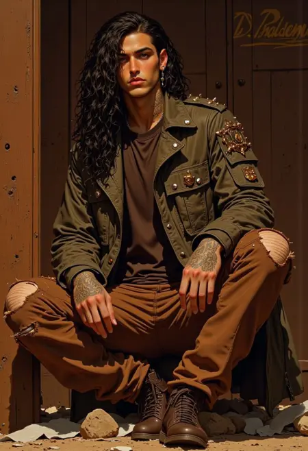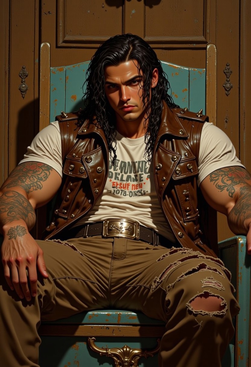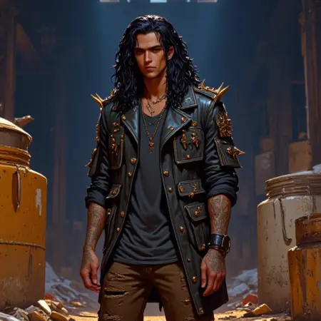 The model is likely to respond well to descriptions of clothing that especially focuses leather (vest, jacket, trenchcoat, pants, belt, boots, wrist bands, bracers, etc) as well as descriptions of tears, rips, studs, spikes, and patches. It will do well with descriptions of tattoos (neck, forearm, sleeve, arm, hand, etc). Jewelry was included in the prompts (ring, watch, necklace, etc).