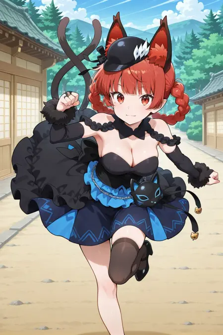 kaenbyou rin, 1girl, solo, red eyes, red hair, blunt bangs, twin braids, side braids, braided hair rings, mole under eye, cat ears, animal ear fluff, cat tail, two tails, medium breasts,, kaenbyou rin \(pikara flame\), alternate costume, alternate hairstyle, black hat, cleavage, black dress, detached collar, detached sleeves, bare shoulders, chain, fox mask, black mask, mask around waist, two-tone skirt, black skirt, blue skirt, black thighhighs, single thighhigh, high heels, black socks,