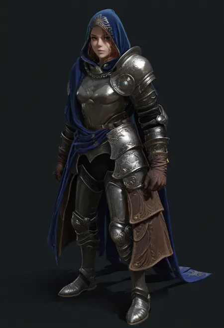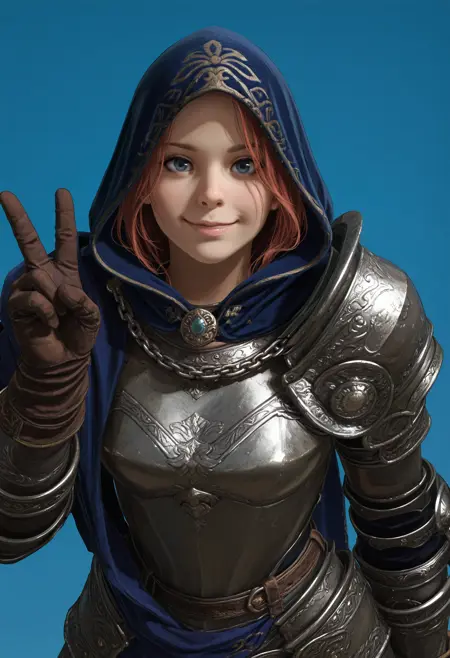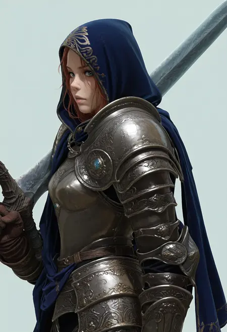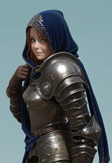 resbilf, 1girl, blue eyes, red hair, armor, hood, shoulder armor, gloves, hood up, boots