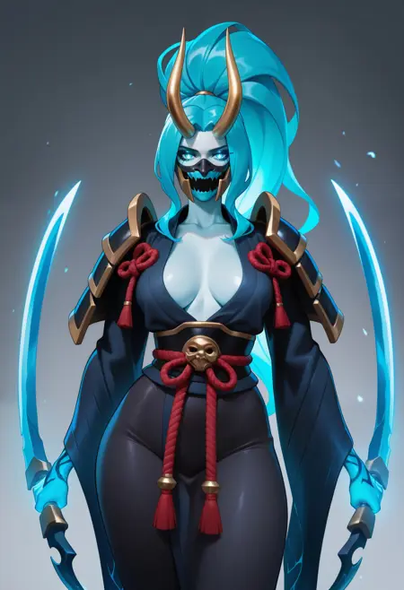 类似 Onikage 弟子:金色角,和服,腰带,绳索腰带,水色头发,马尾,肩甲,中分刘海,腰带上佩戴鬼面具,黑色长裤,护膝,面罩,